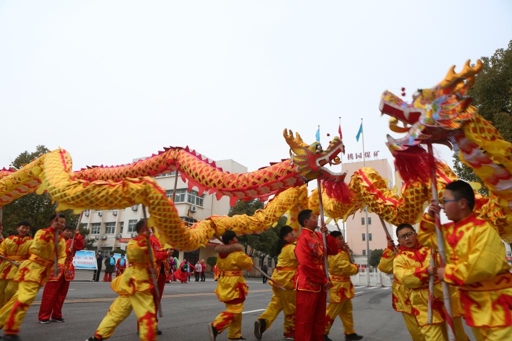 早上七點半,伴隨著陣陣威風鑼鼓聲,兩條舞龍在礦工業廣場上翻騰穿梭,上下游動,象征著淮礦集團艱苦創新業,開拓爭一流的企業精神,寓意著該礦干群在新的一年里,將沿著一張藍圖繪到底,擼起袖子加油干的拼搏精神。