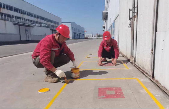 在AGV高架庫出入口,張勇、趙自衛正在忙碌著?!斑@是干什么呢”“返庫位、出貨位標志已經模糊,導致探頭識別力減弱,為了使標識更加規范鮮明,使貨位識別更加快速精準,我們要重新給予畫線?!敝灰娝麄兓ハ嗯浜?,先用透明膠帶把黃線邊緣粘上,然后用黃色油漆刷新。