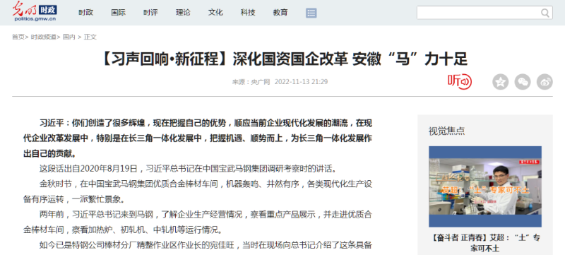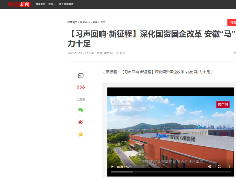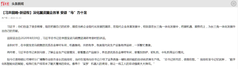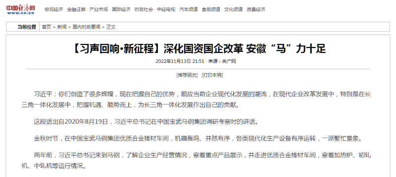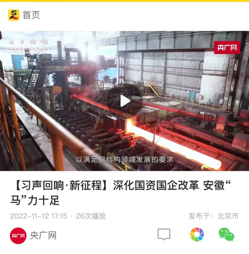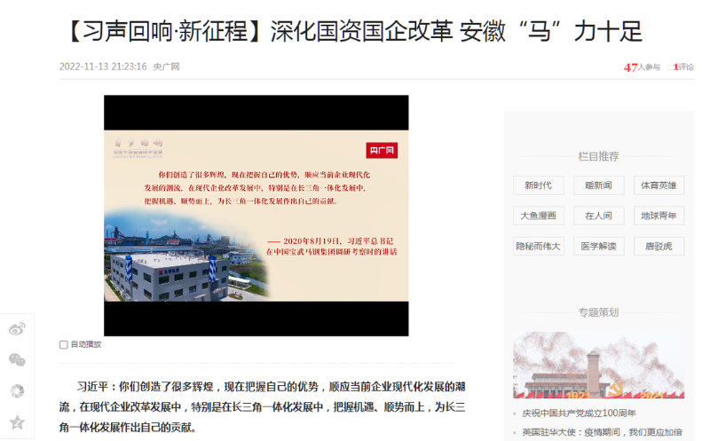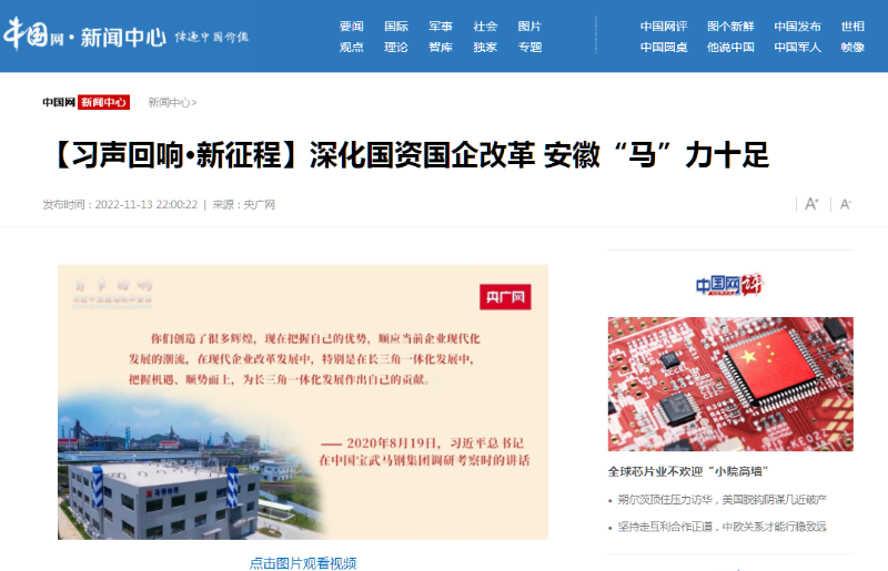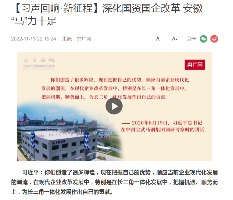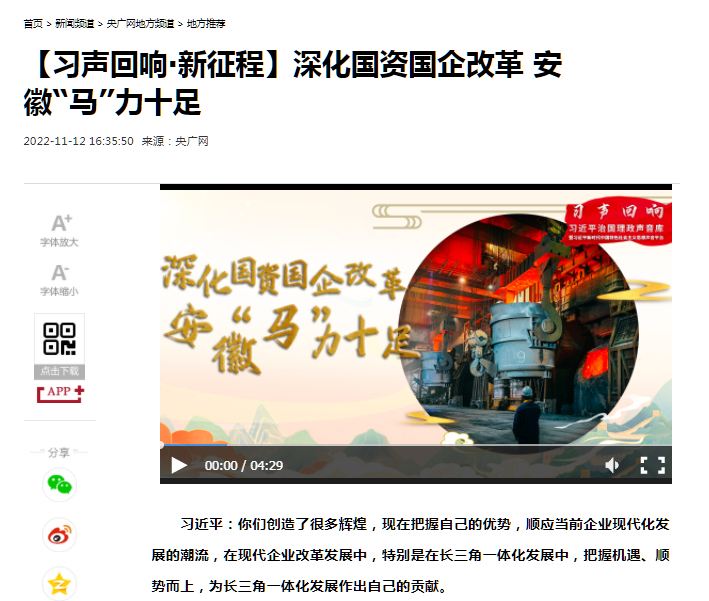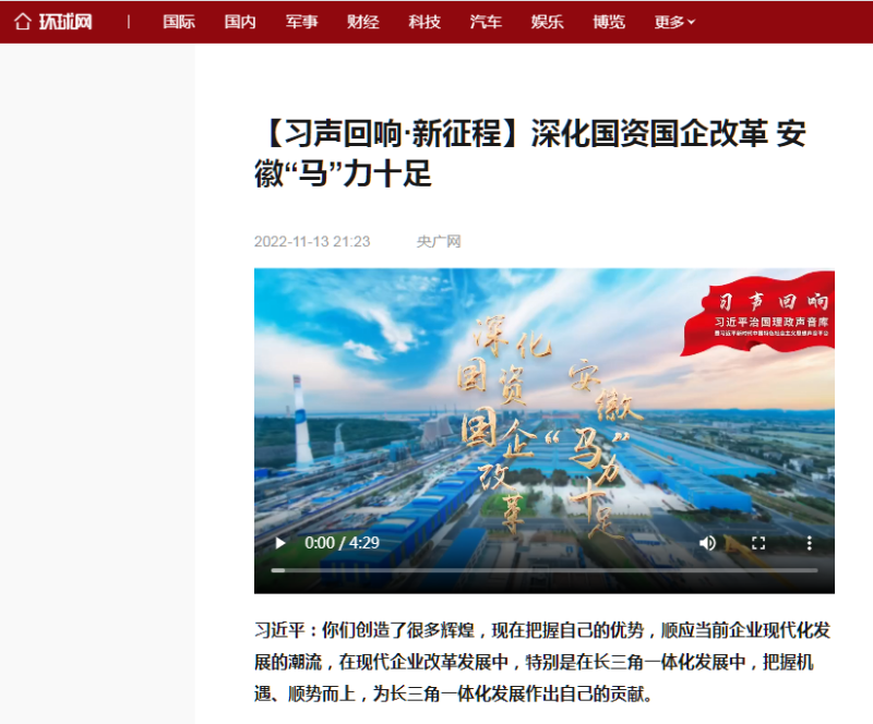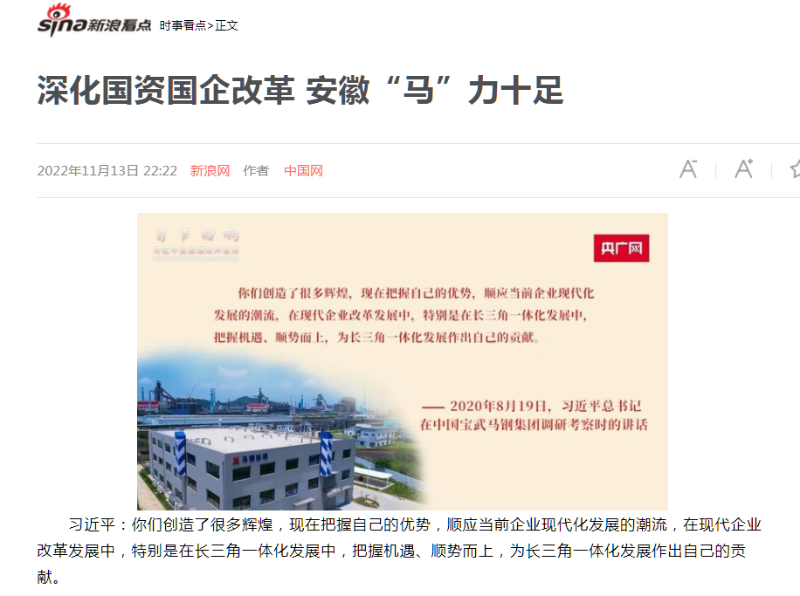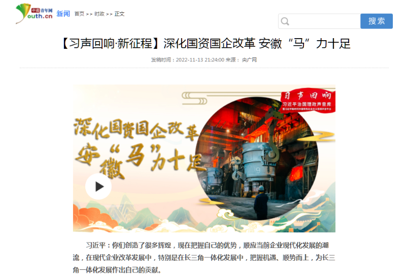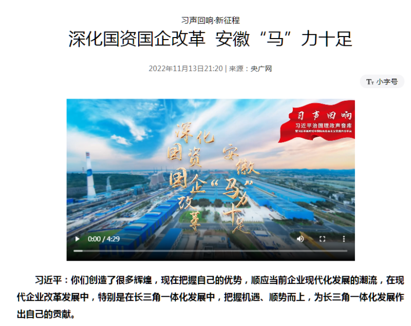 搶抓發展機遇,敢為時代先鋒。國企改革三年行動以來,安徽國資國企深化改革創新,不斷轉型突破,推動省屬企業高質量發展邁上新臺階。2021年,安徽省屬國有企業經營業績創歷史最好水平。今年上半年,省屬企業資產總額首次突破2萬億元。目前,安徽省國企改革三年行動的129項重點任務已基本完成。央廣網、人民網、中國網、中華網、光明網、環球網、中國經濟網、中國青年網、中青在線、新浪網、網易網、騰訊網、搜狐網、鳳凰網等15家全國主流媒體及30余家省級主流媒體對此進行了集中報道。