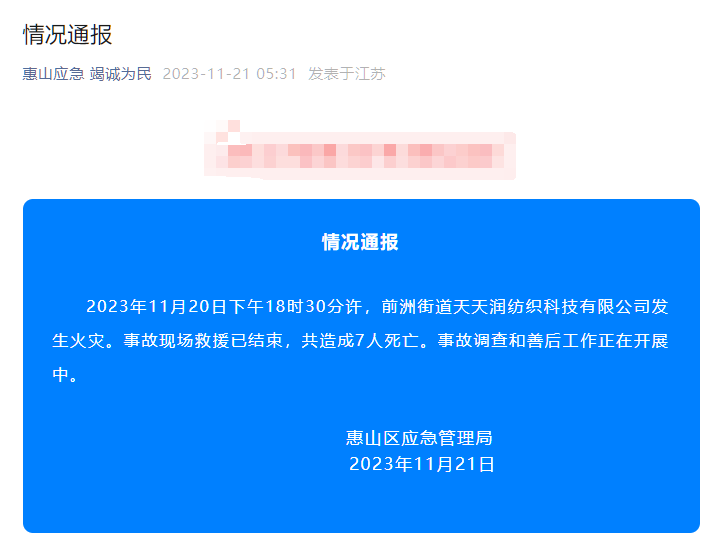 江蘇省無錫市一紡織廠11月20日晚間發(fā)生火災(zāi),事故造成7人死亡。據(jù)無錫市惠山區(qū)應(yīng)急管理局發(fā)布的信息,惠山區(qū)前洲街道天天潤紡織科技有限公司11月20日18時(shí)30分許發(fā)生火災(zāi),事故共造成7人死亡。目前事故救援已經(jīng)結(jié)束,善后工作已展開,事故原因正在調(diào)查中。另據(jù)惠山區(qū)委宣傳部提供的信息,事故中沒有發(fā)現(xiàn)其他受傷人員。