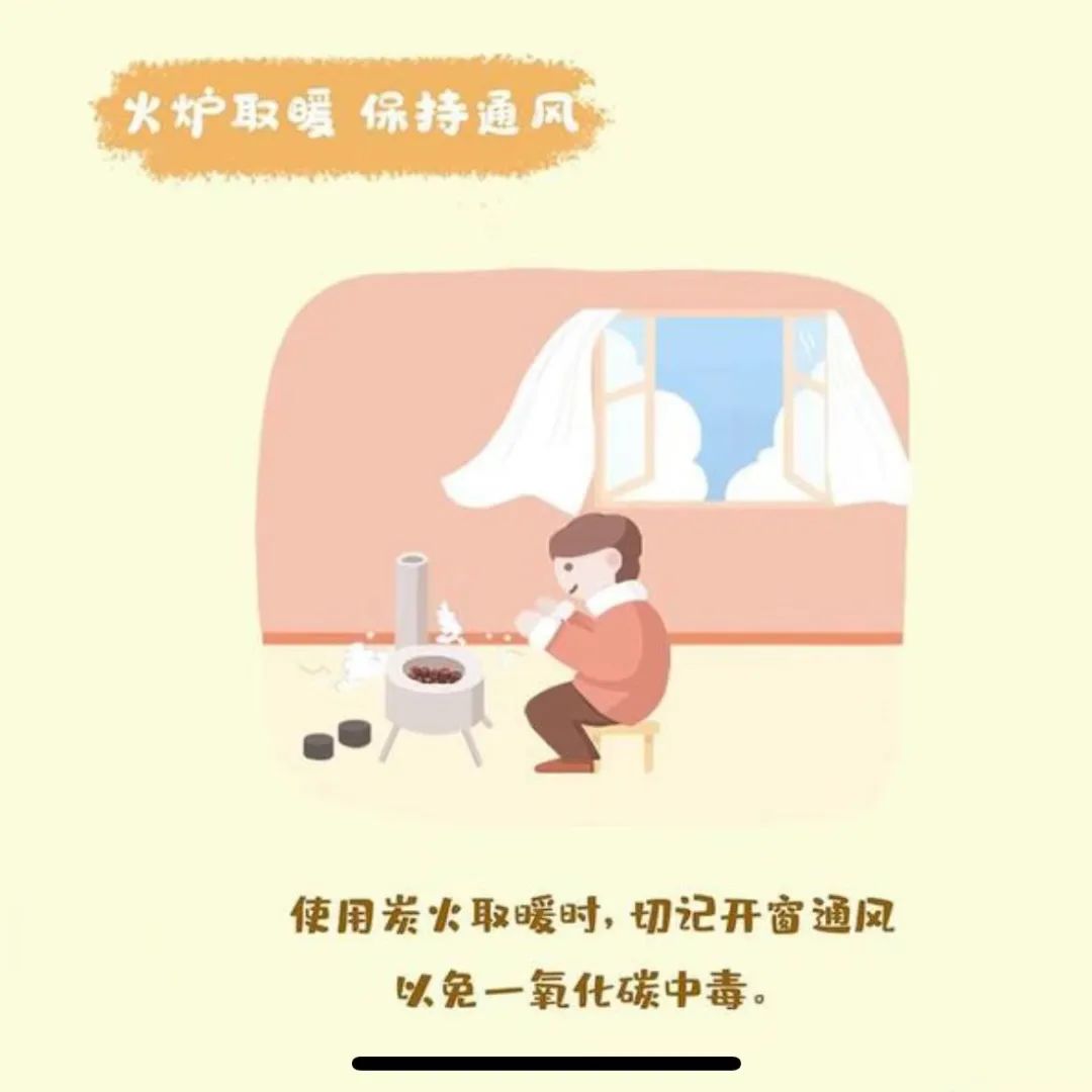 2.注意通風(fēng):室內(nèi)使用煤爐、炭火等取暖設(shè)備時,煤炭要燒盡,不要悶蓋;門窗要預(yù)留一定的縫隙,保持室內(nèi)空氣流通,避免一氧化碳聚積。